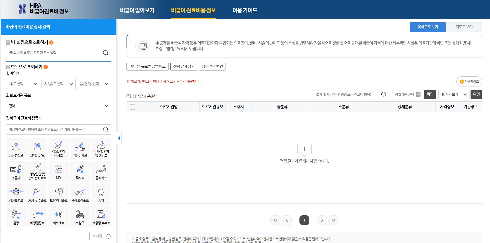 아니면 그 지역 내에서 특정 진료비 항목을 적어서 검색을 해볼 수 있습니다.