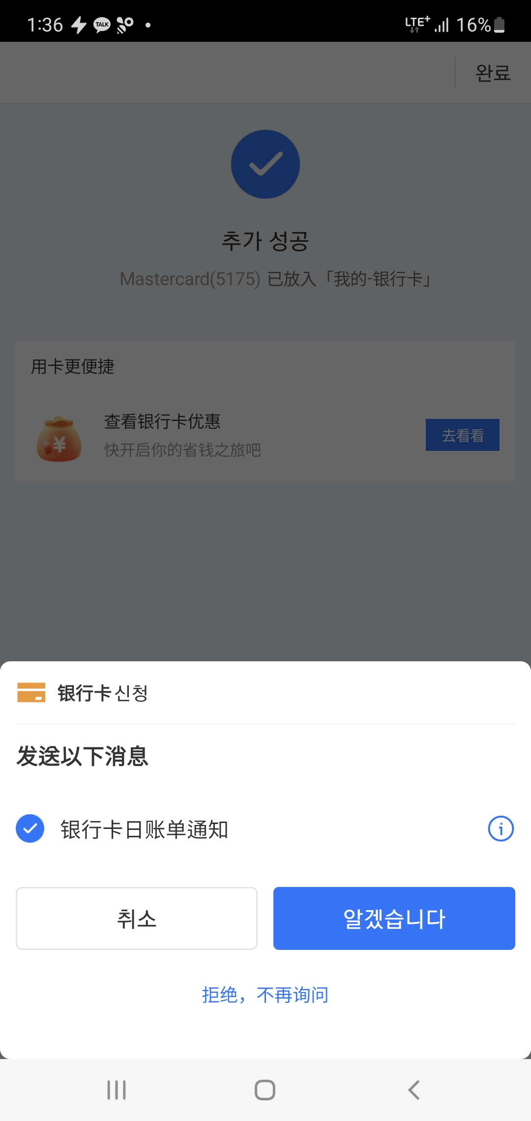 그럼 이제 내 카드로 직접 결제하기 위해서 알리페이에 카드를 등록해 봐야지..